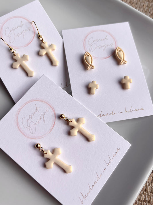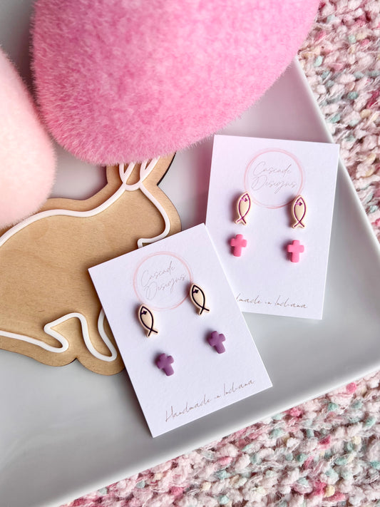 The Ichthys | Mini Fish and Cross Clay Earring Studs - Set of 2