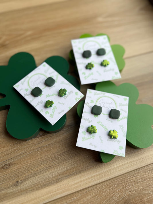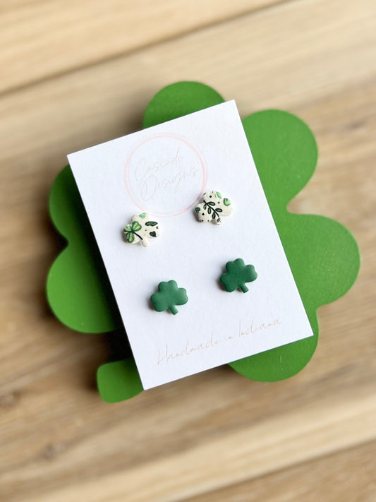 The Shamrock | Green and Sparkle Clover Clay Studs Earrings - Set of 2