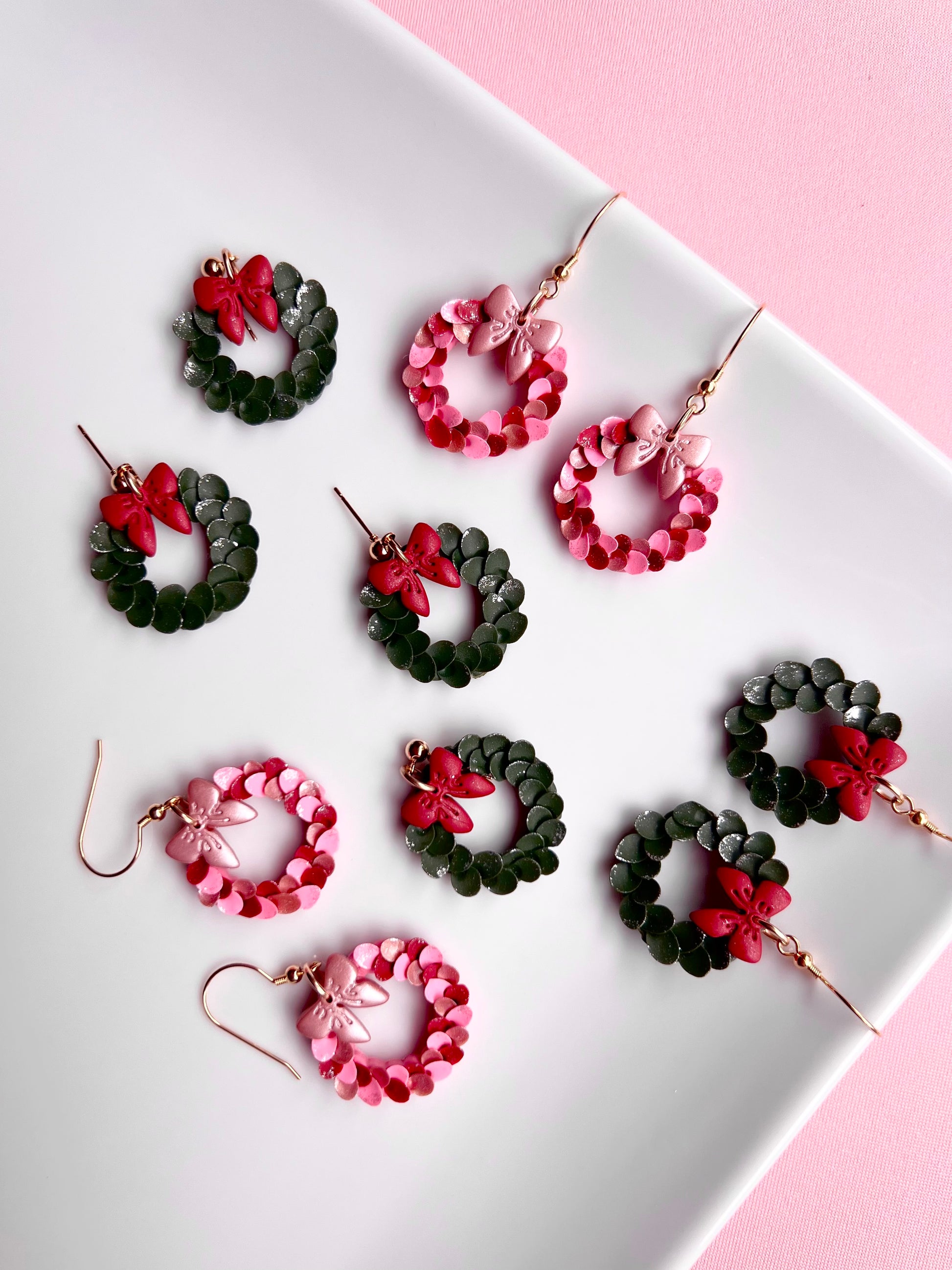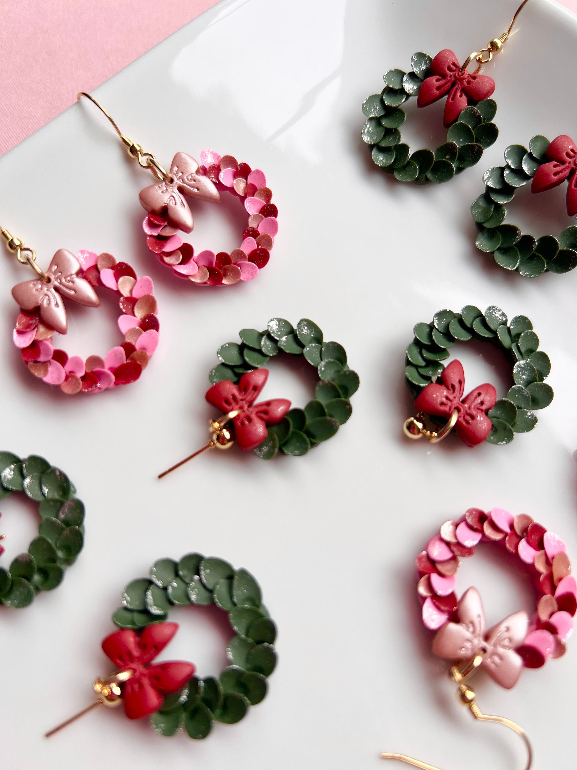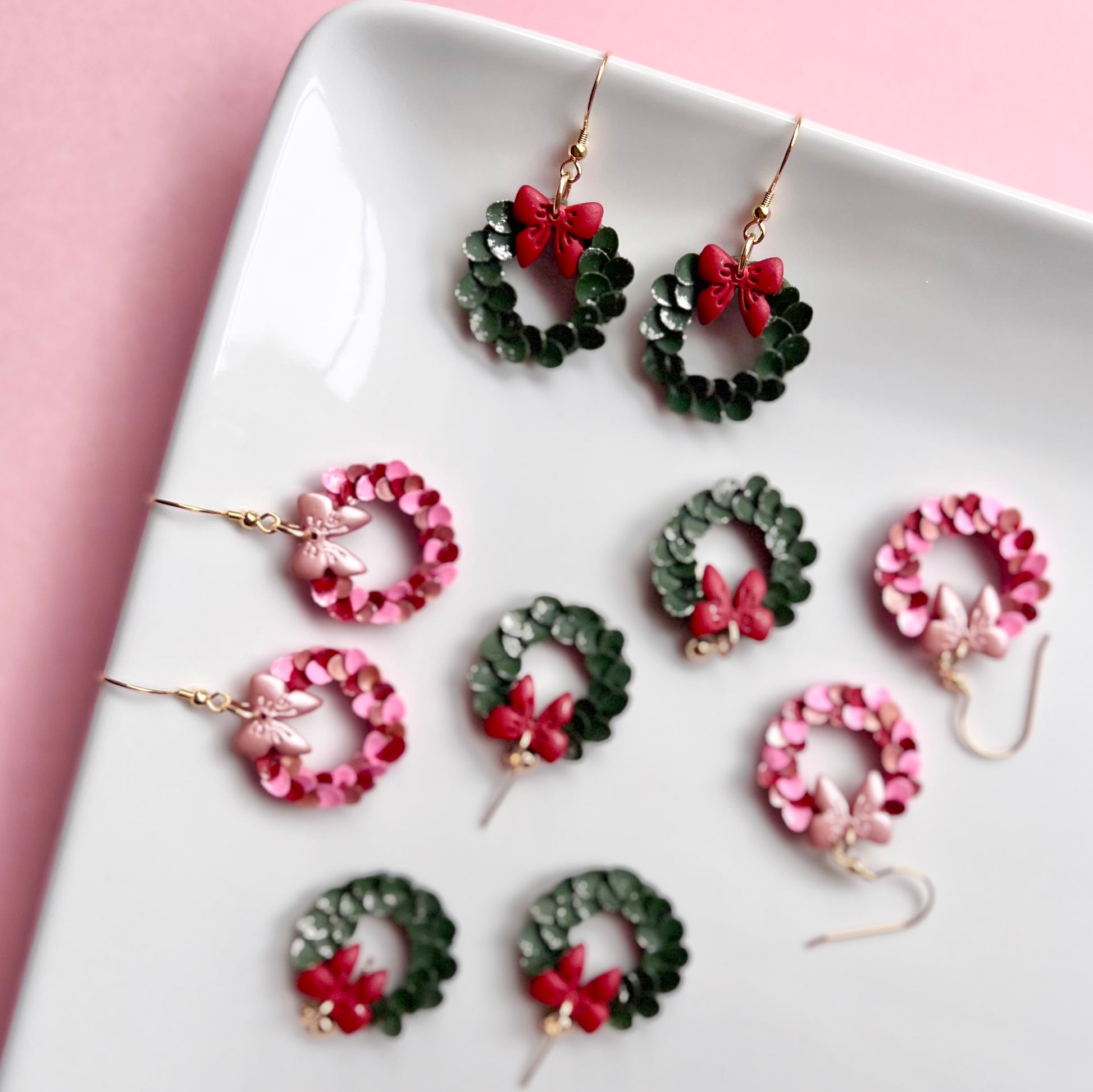 Add a touch of whimsy this winter with these dusted Christmas wreath earring dangles.