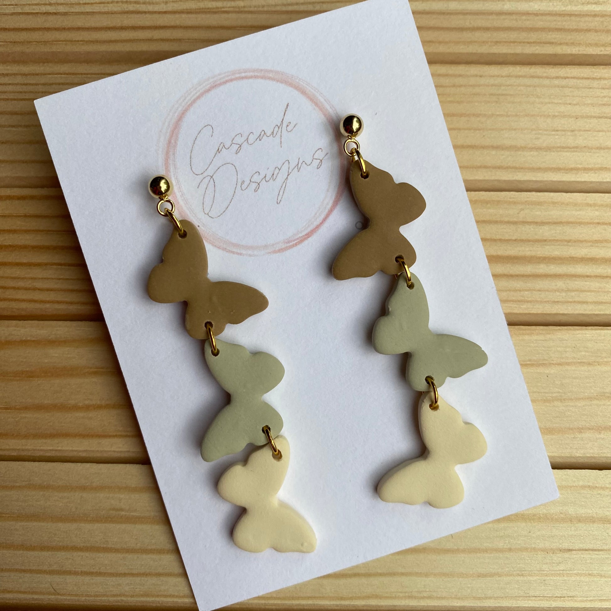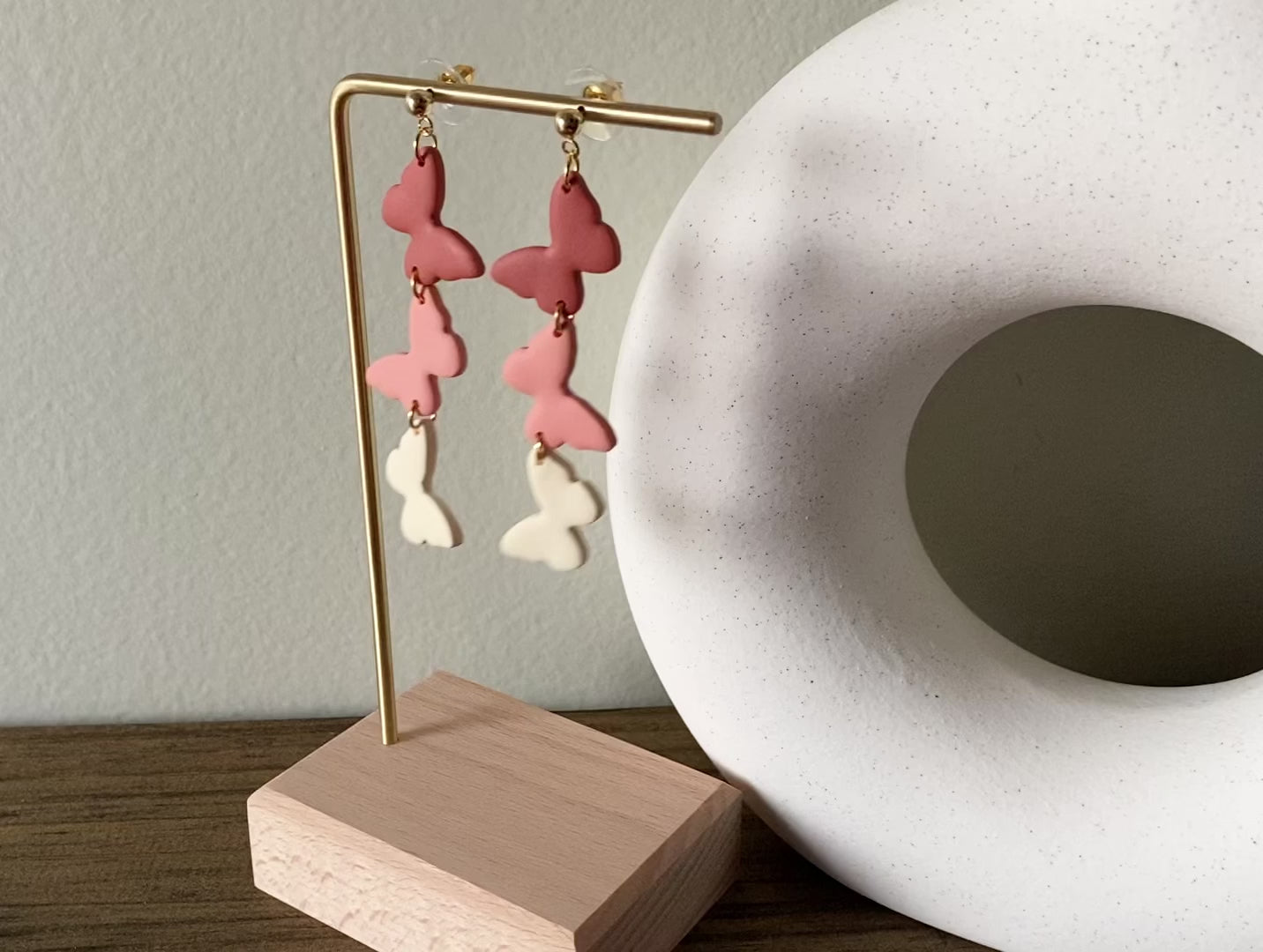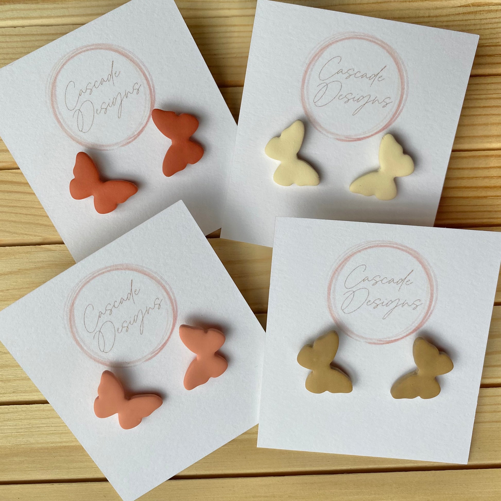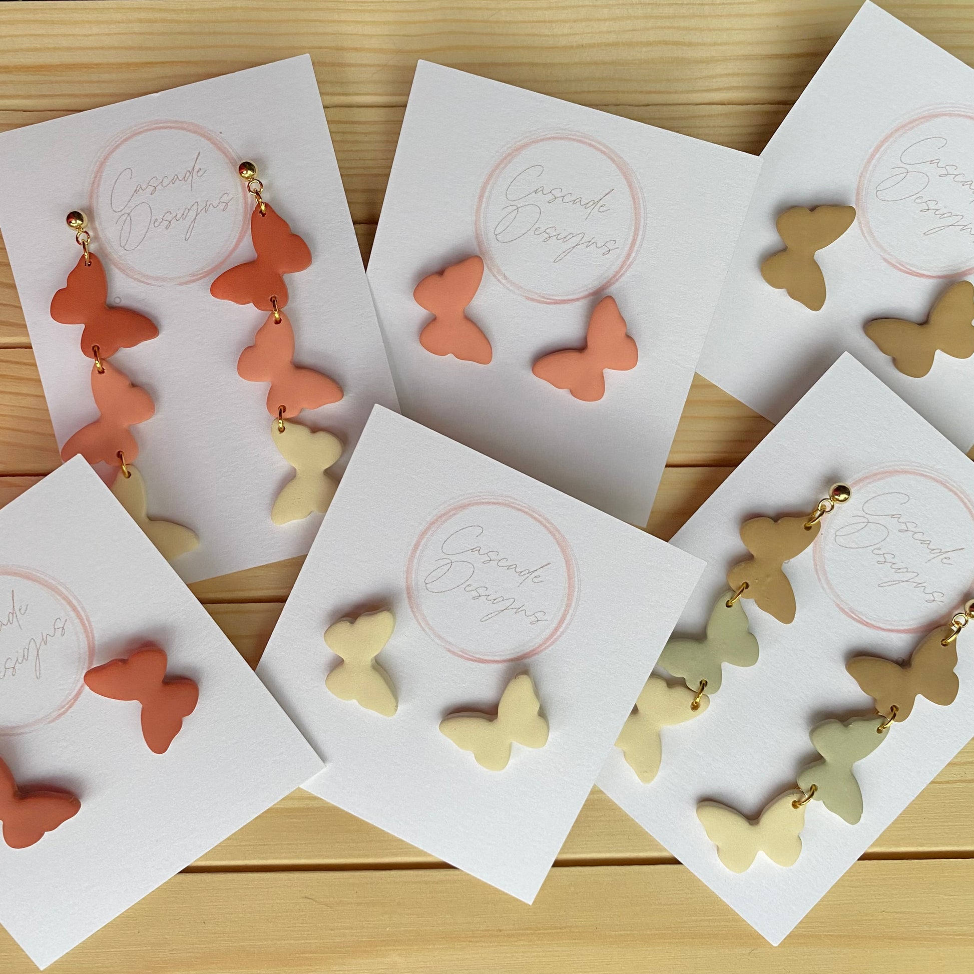 These butterfly stud and triple-tiered polymer clay earrings are handmade with love. With a super lightweight design, they are easy to wear for any occasion.