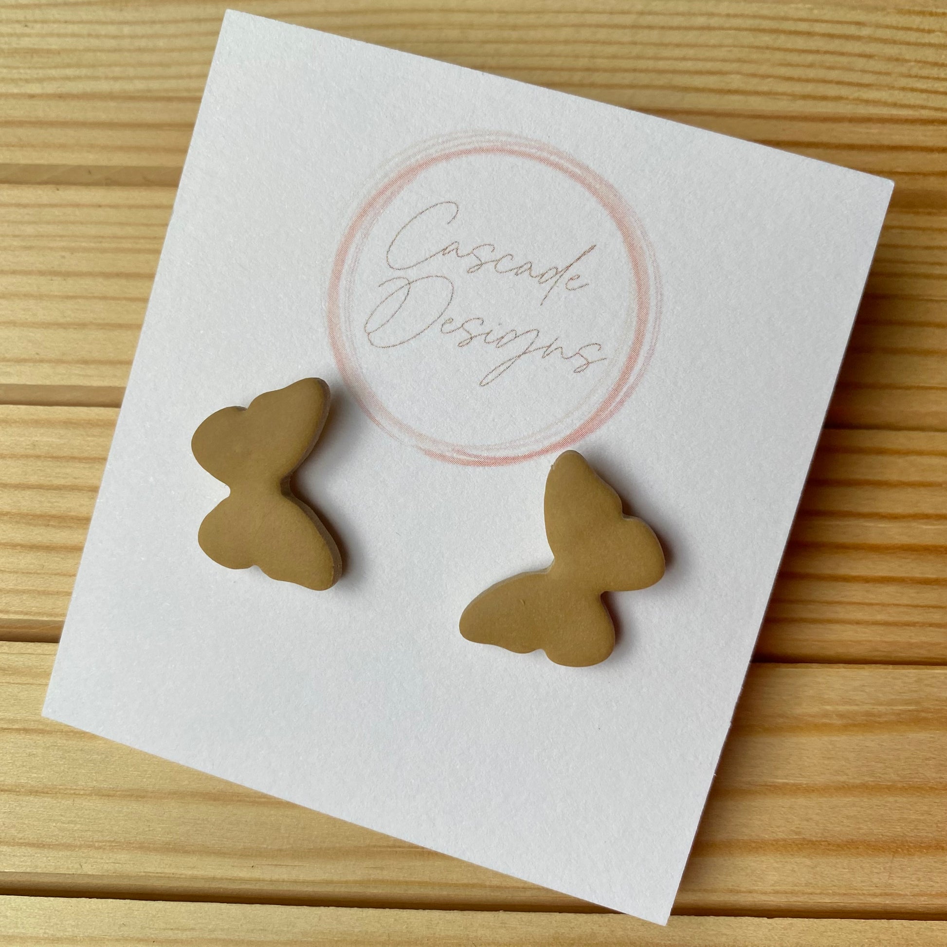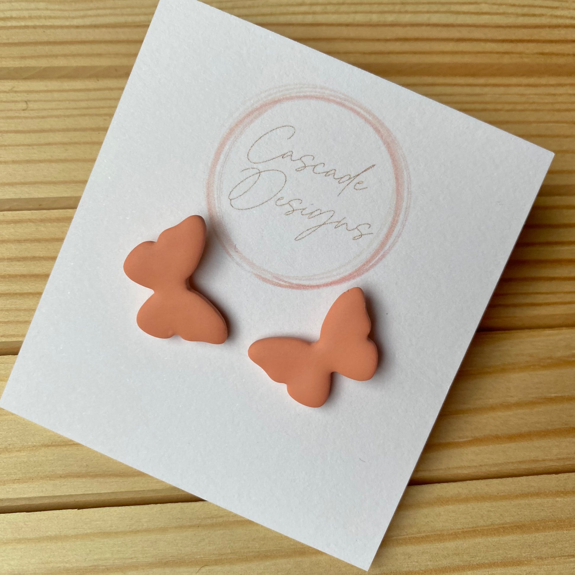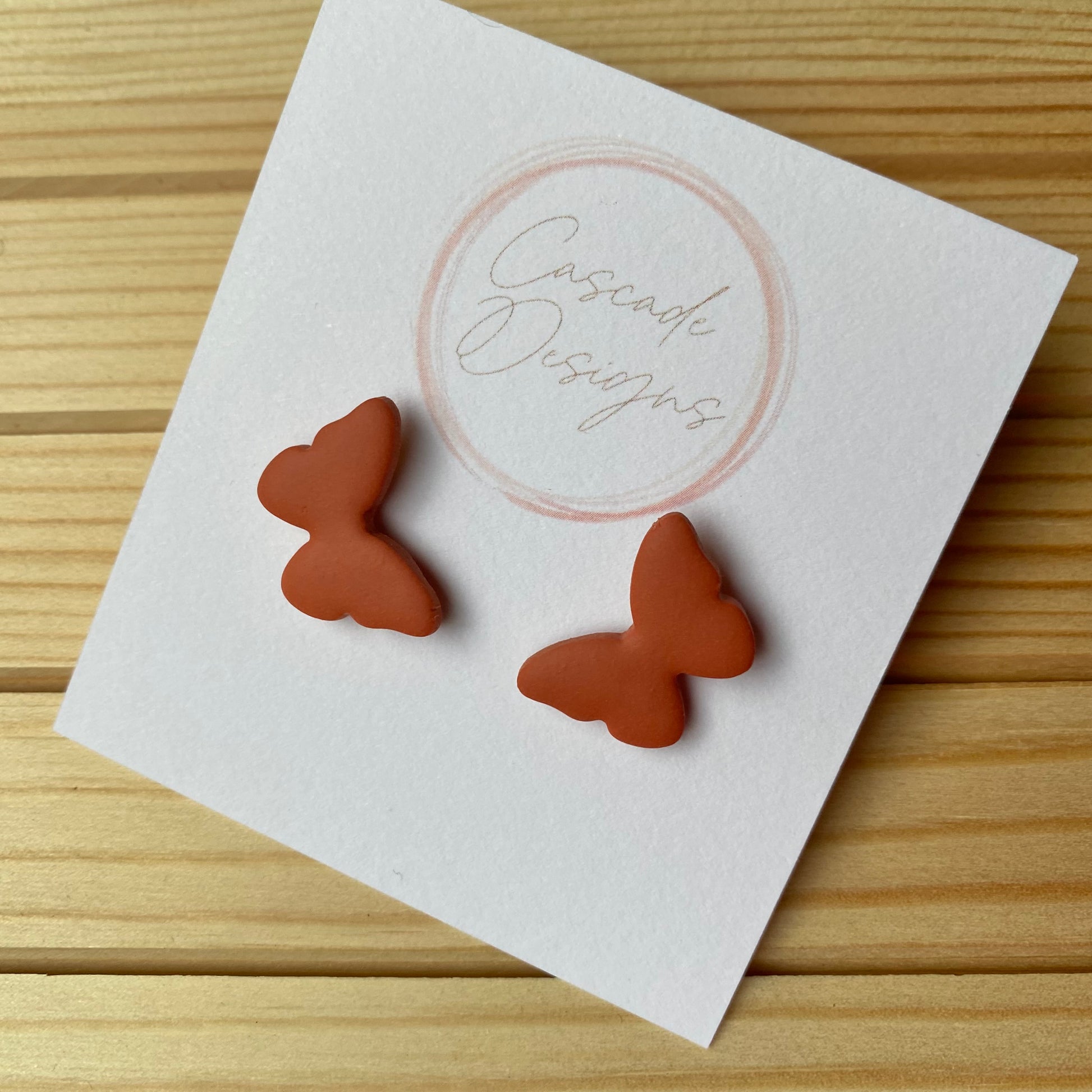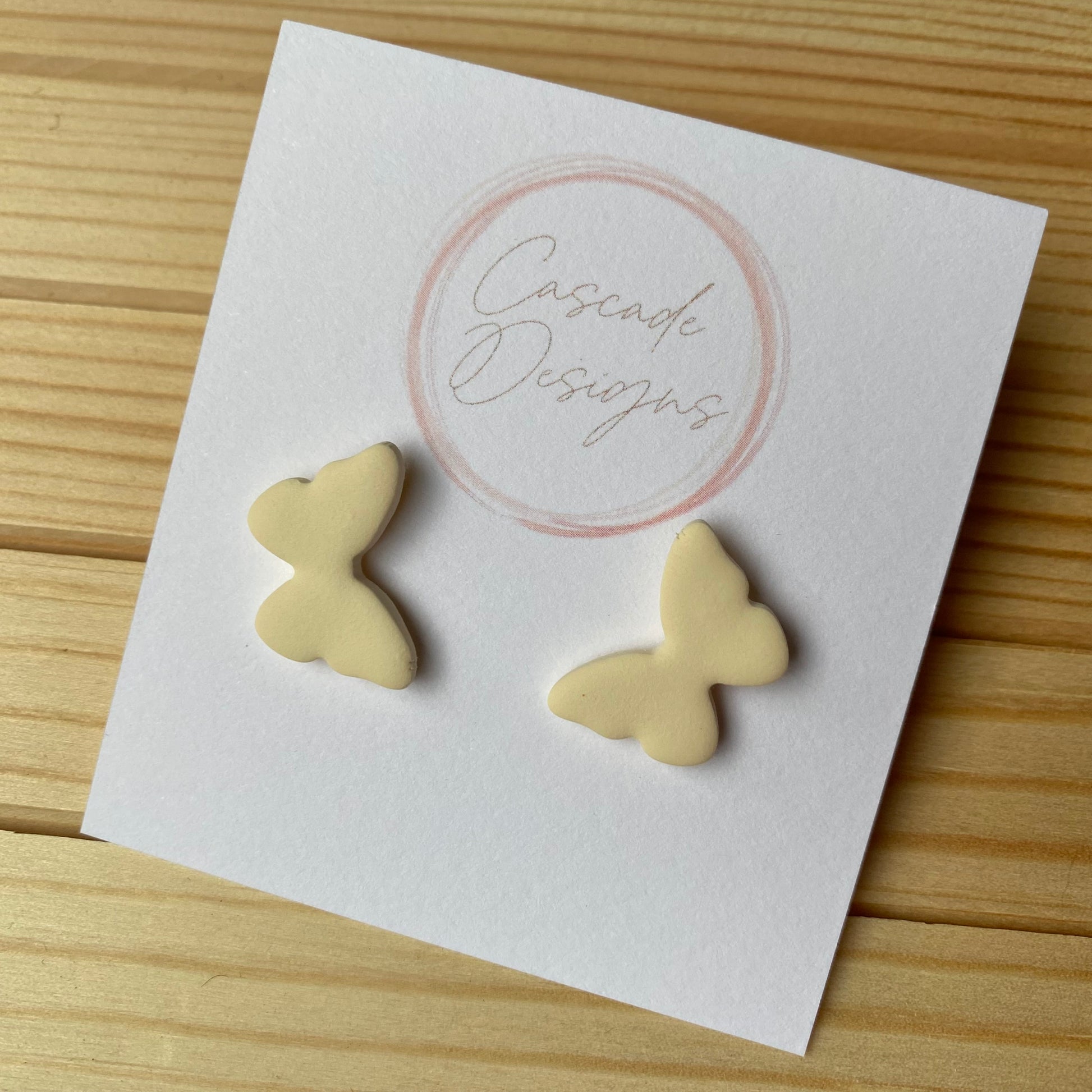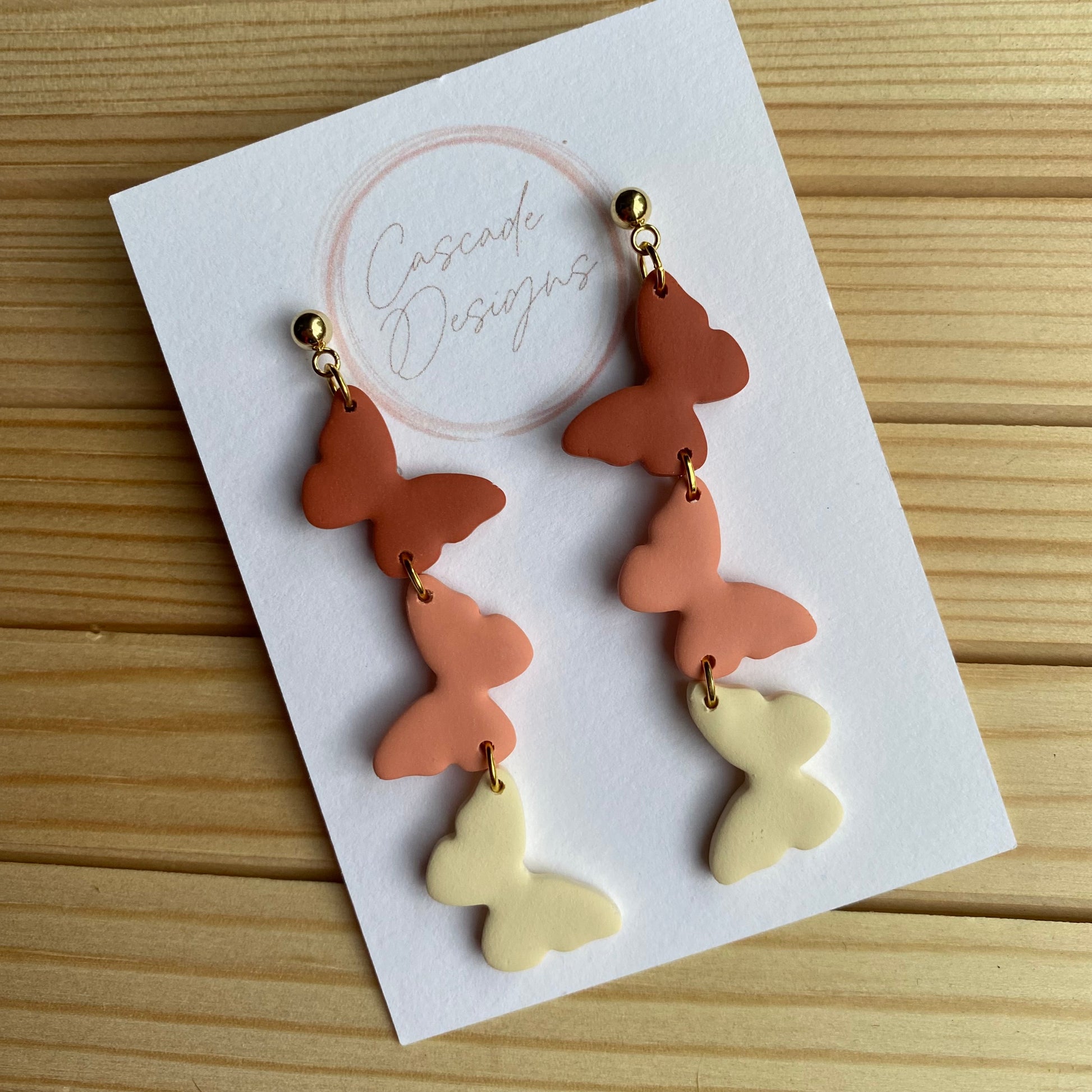 These butterfly stud and triple-tiered polymer clay earrings are handmade with love. With a super lightweight design, they are easy to wear for any occasion.