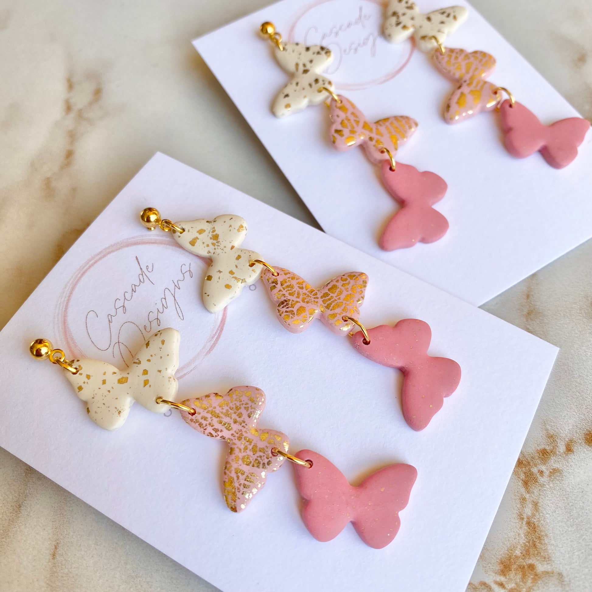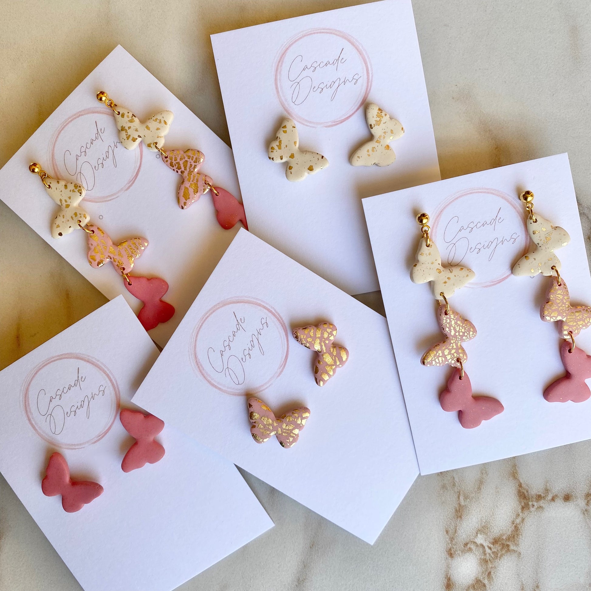 These gold flake butterfly stud and triple-tiered polymer clay earrings are handmade with love. With a super lightweight design, they are easy to wear for any occasion. Pair these earrings with our matching necklace for the full set!